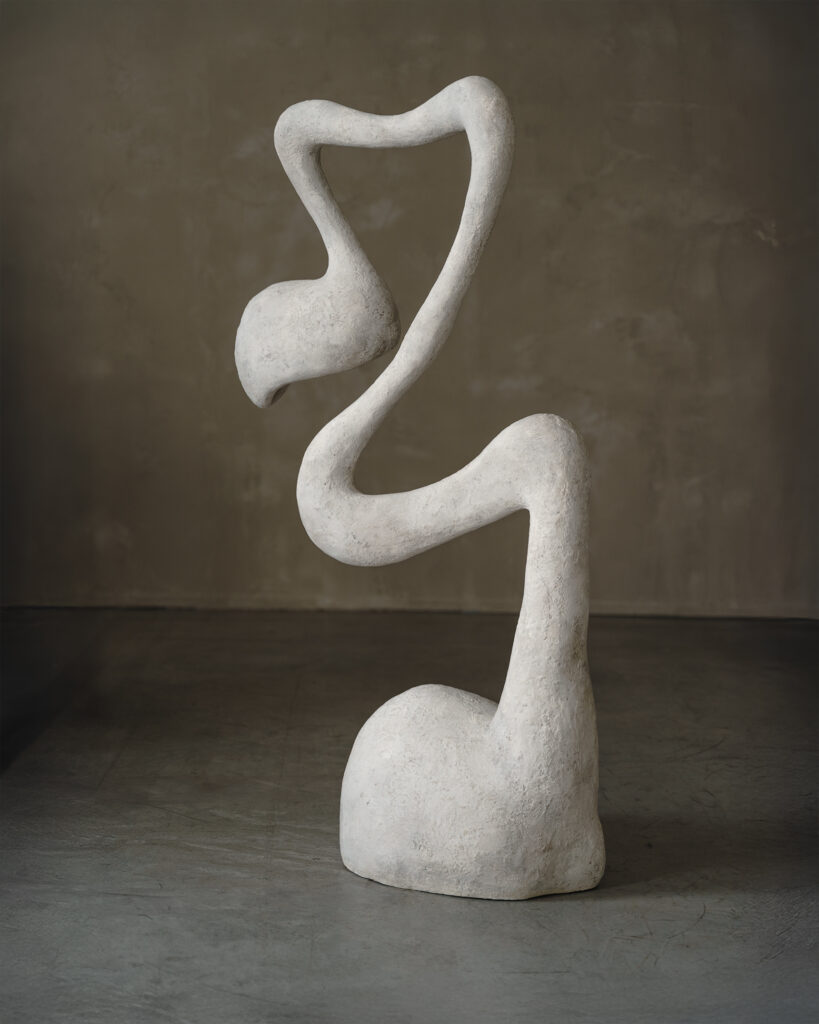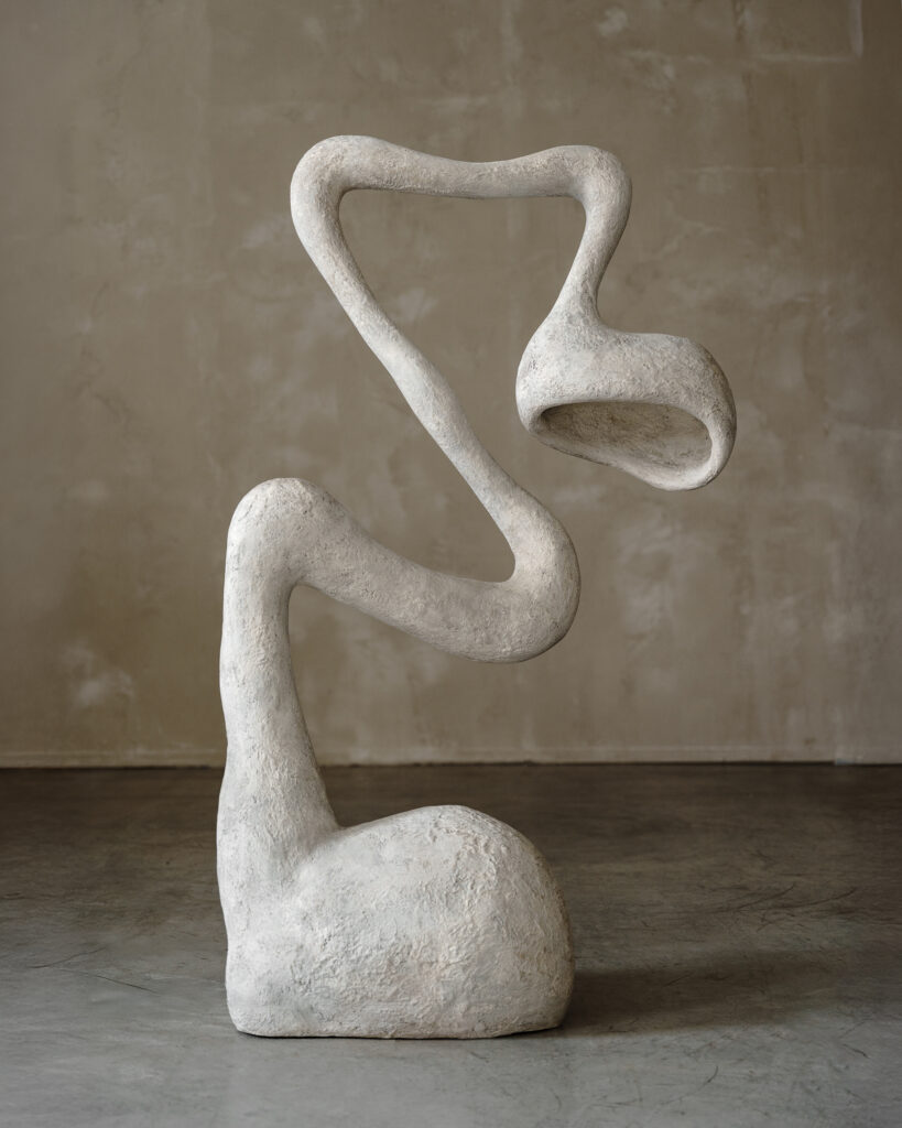 Each lamp is meticulously handmade using a composite of recycled paper and a fiberglass frame, hand-finished to ensure its distinctive aesthetic. The fluid, asymmetrical design gives it a sculptural presence, making it a striking addition to contemporary interiors.
