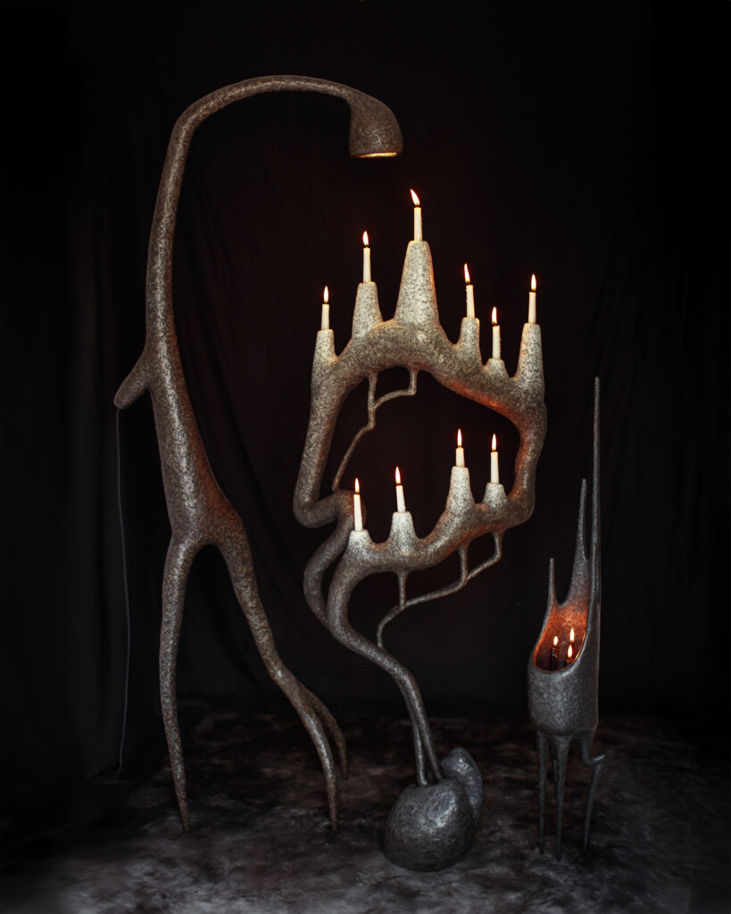 ECCLESIO is a sculptural candleholder where bionic elegance meets the mystery of a solar eclipse. Slender, flame-like spires rise above long, poised legs, giving it the commanding presence of a totemic figure.
